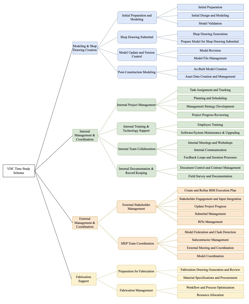 This schema provides a comprehensive overview of the various activities involved in VDC, categorizing them into key areas such as Modeling & Shop Drawing Creation, Internal Management & Coordination, External Management & Coordination, and Fabrication Support. Each category further details specific tasks and processes, offering a structured approach to understanding VDC workflows and scopes. Brief explanations of the schema can be found below the schema diagram. For detailed explanations of the schema and the development process, please refer to the paper.
